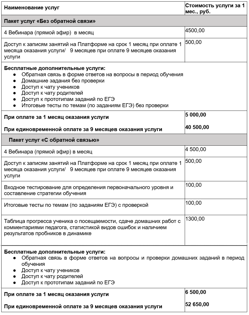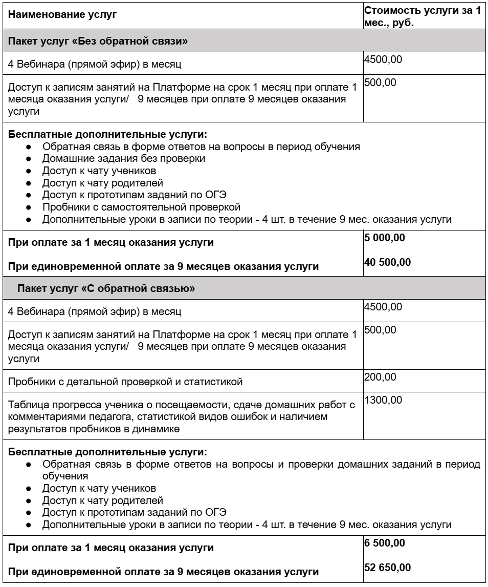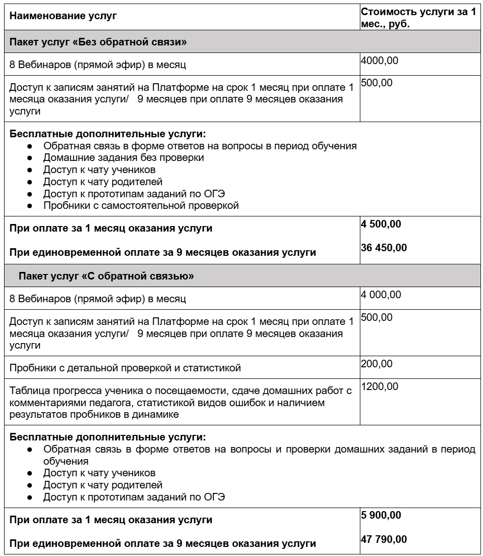 2.13. Пакет услуг — комбинация определенного перечня платных и бесплатных услуг, предоставляемых вместе с основной образовательной услугой, дополняющих и улучшающих онлайн-курс. Утвержденные пакеты Услуг публикуются на Сайте.